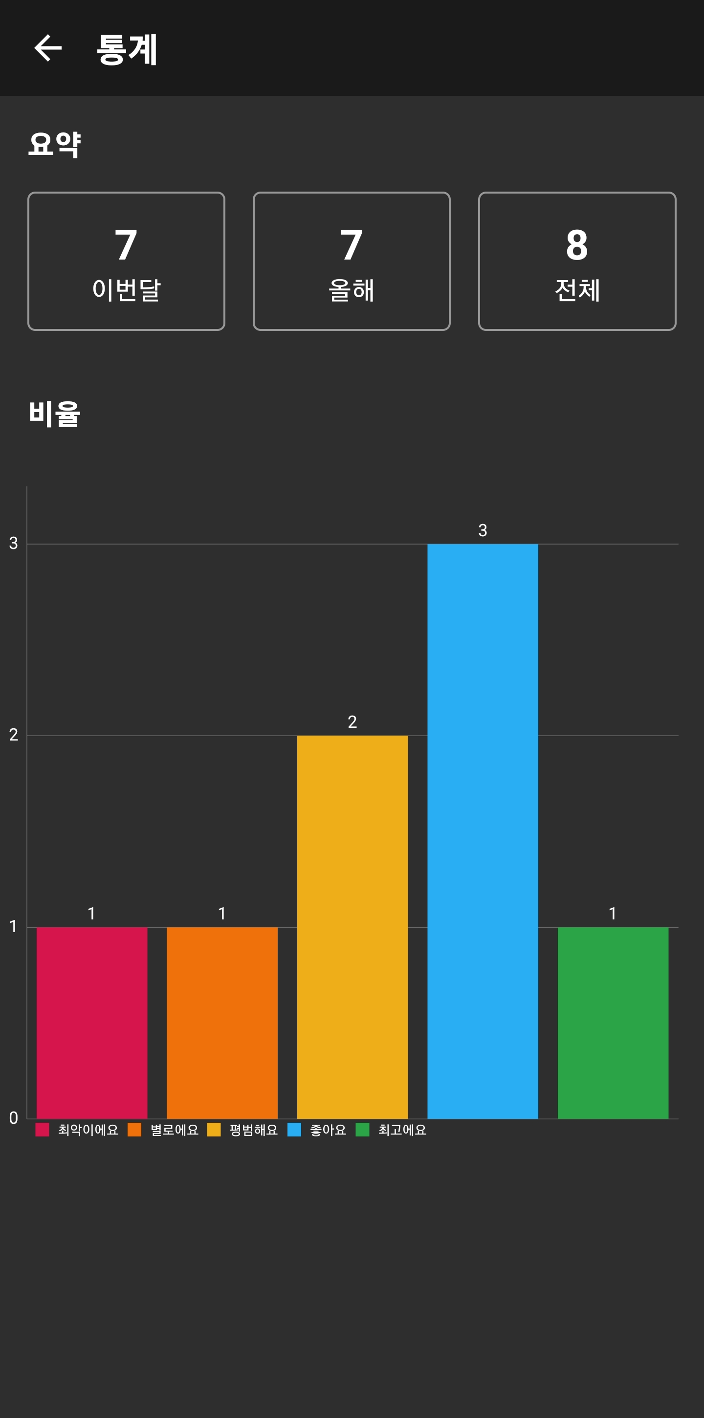 - 일번달, 올해, 전체를 기준으로 5가지 감정(색상)(최악이에요, 별로예요, 평범해요, 좋아요, 최고예요)의 통계를 확인할 수 있습니다.