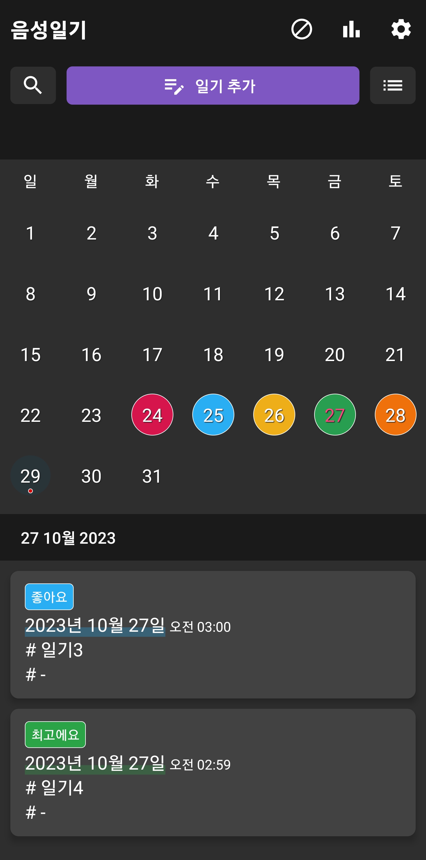 - 원하는 날짜를 선택 후 5가지 감정(색상)을 선택합니다. 제목과 내용을 적어주고 음성일기를 작성합니다.