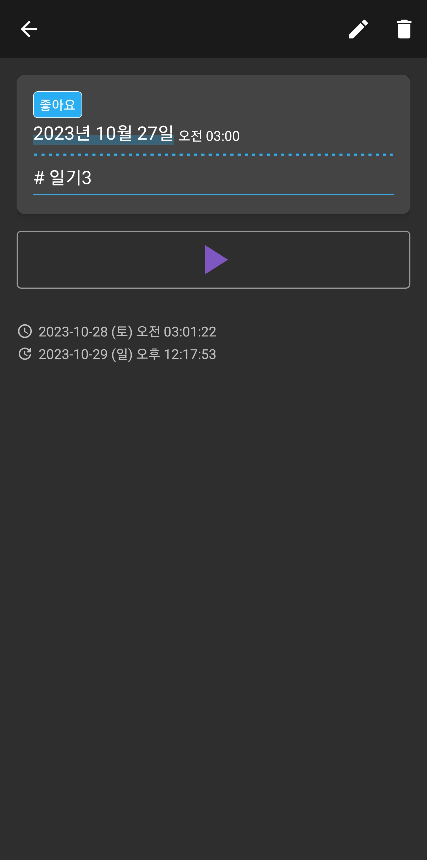 - 일기를 확인하고 제목, 내용, 감정, 음성파일, 사진 등을 확인할 수 있습니다.